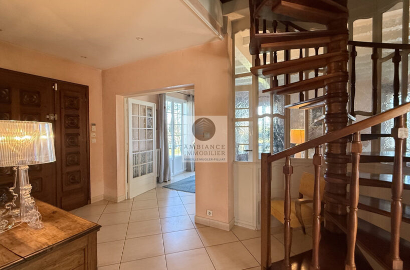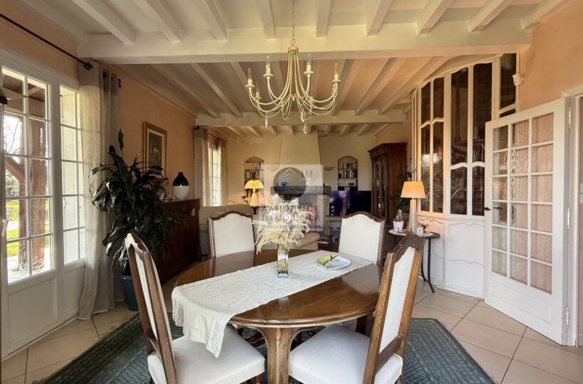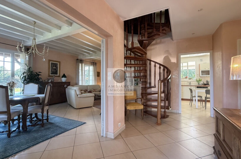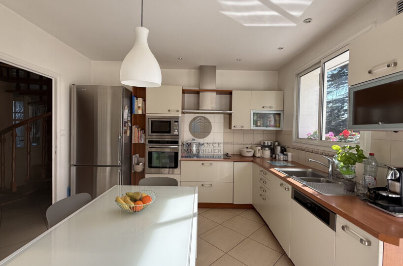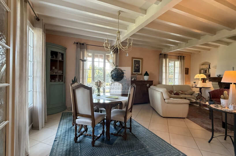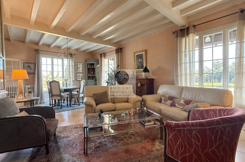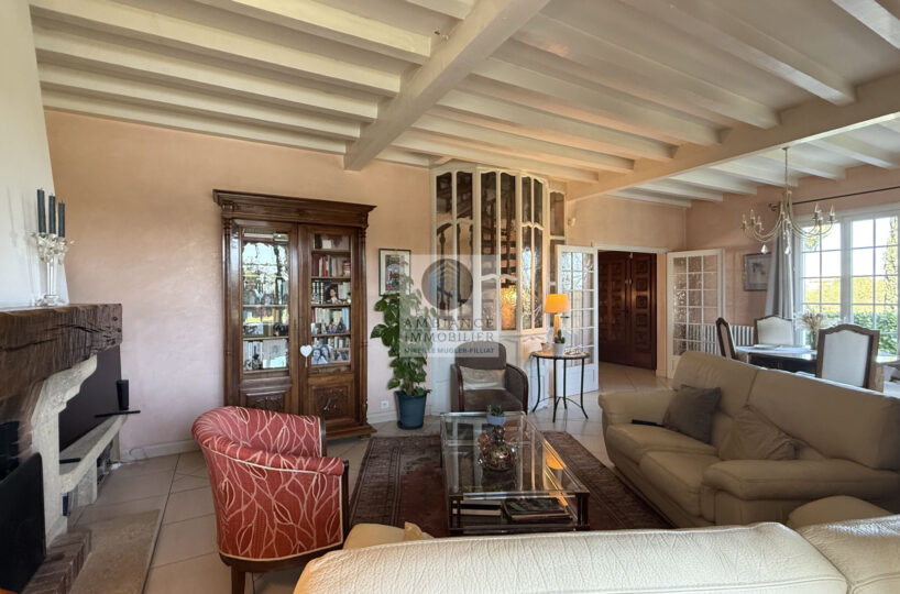 Une entrée spacieuse desservant une belle pièce de vie : séjour-salon de 35m2 avec cheminée et plafond à la française et accès à une terrasse couverte offrant une belle perspective sur le parc, une cuisine joliment intégrée de 15m2.