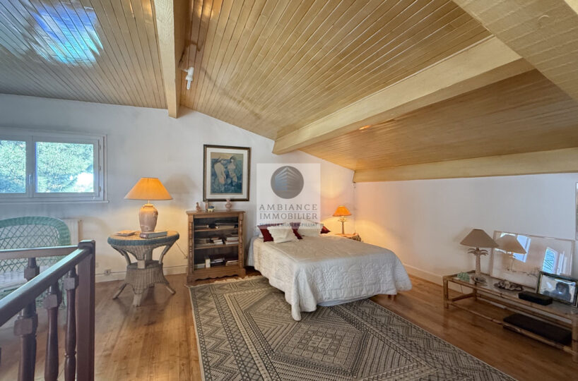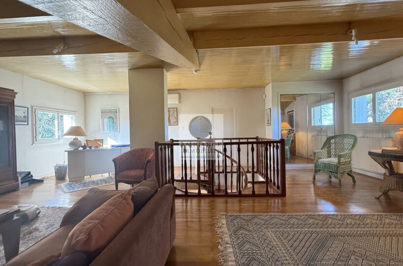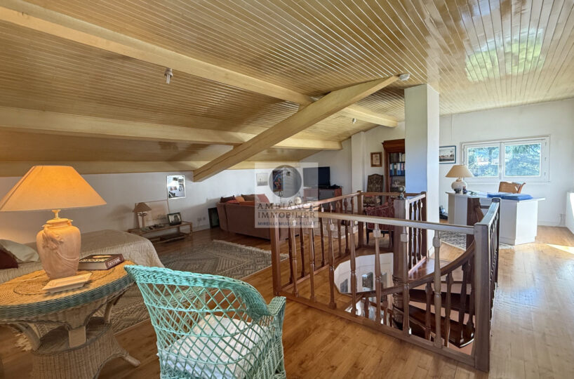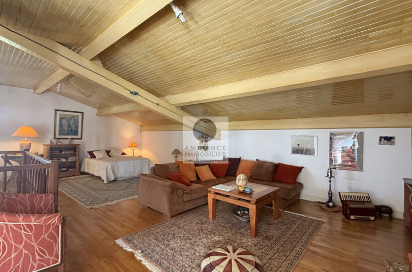 Au 1er étage avec charpente apparente : une vaste pièce détente de 62m2 avec un coin nuit pouvant être fermé et une salle d’eau avec douche et vasque.
