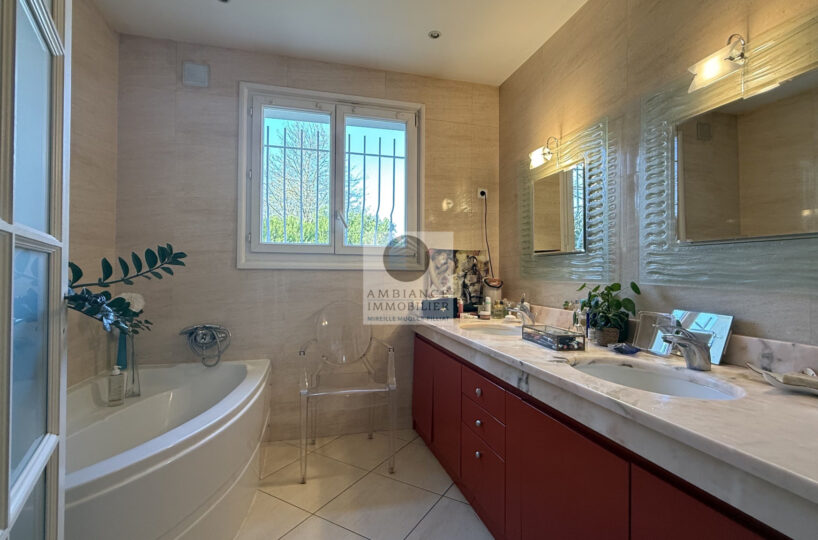 Un espace nuit avec 2 chambres, une salle de bains avec 2 vasques et baignoire.