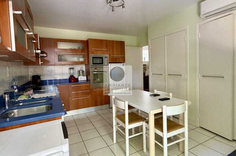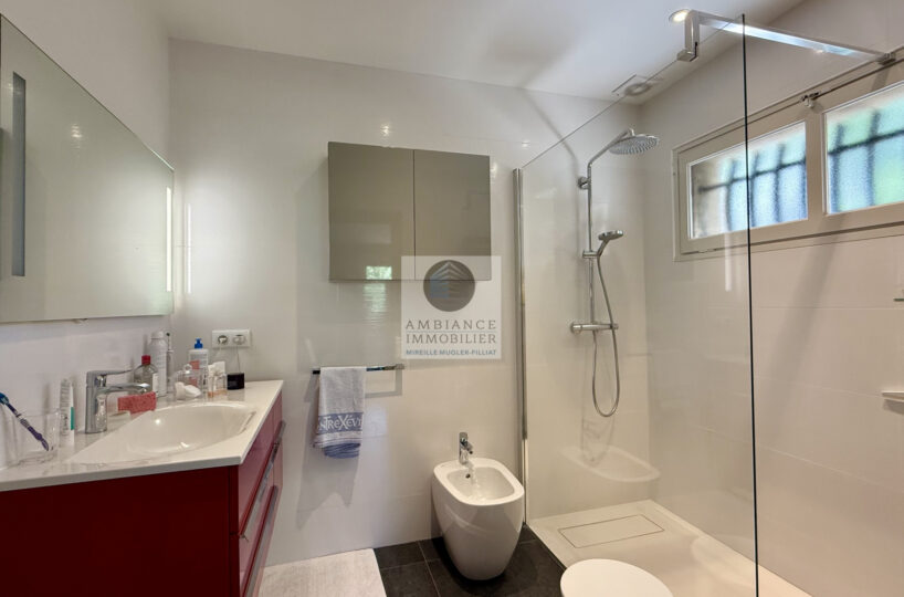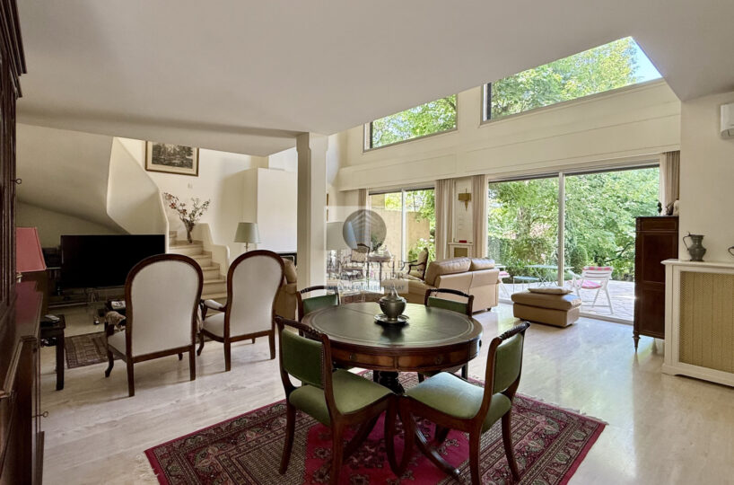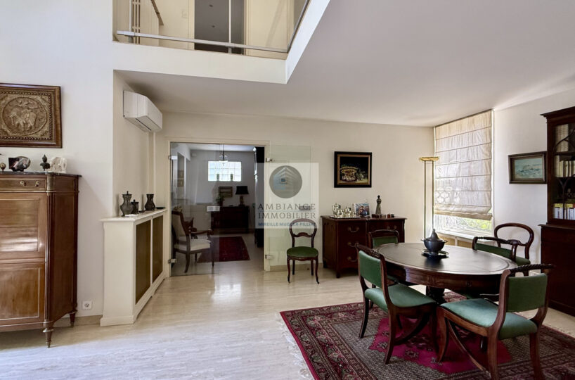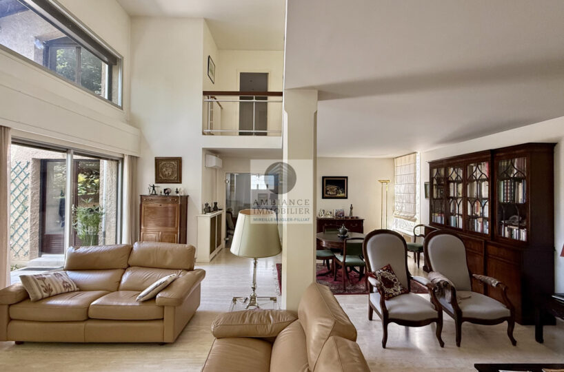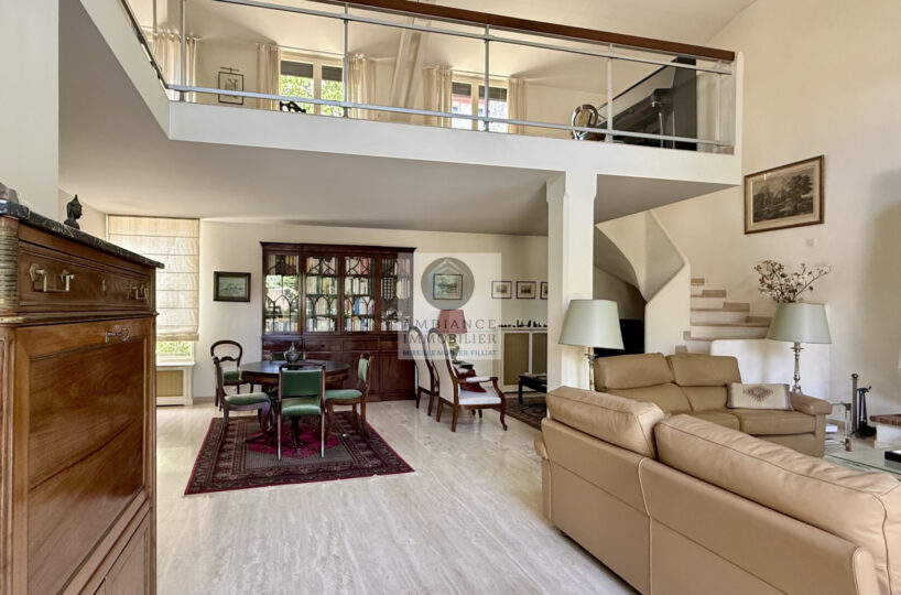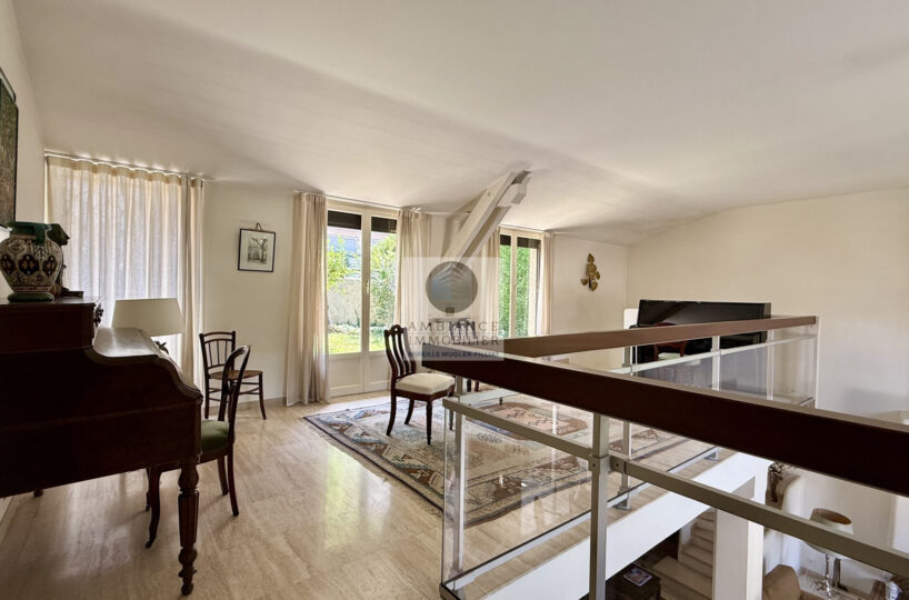 Un salon-séjour de 55m2 avec une cheminée et de grandes baies vitrées offrant une belle perspective sur les terrasses et le jardin, un salon bibliothèque/musique de 23m2 en mezzanine, cuisine intégrée de 15m2, 3 chambres dont 1 suite parentale de 26m2 avec salle d’eau : douche à l’italienne, vasque et dressing, 1 salle d’eau.