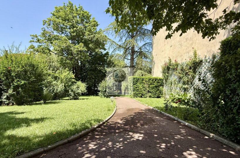 Un jardin joliment paysager avec de grands arbres et de belles essences – arrosage intégré alimenté par un forage – possibilité construction d’une piscine.