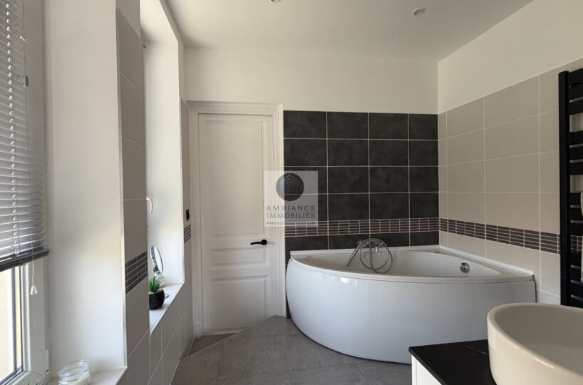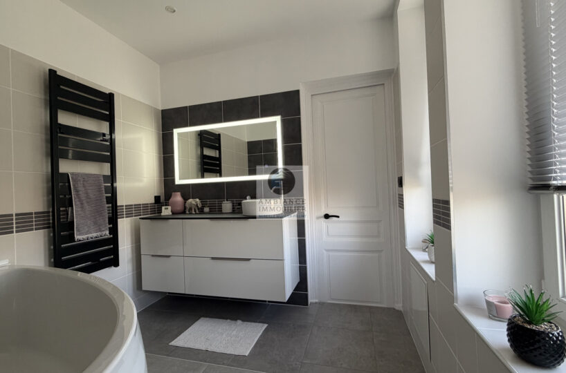 Au 1er étage, un espace nuit avec 3 chambres spacieuses dont 1 chambre parentale de 19m2 climatisée, 1 salle de bains avec baignoire et 2 vasques, 1 salle d’eau avec douche à l’italienne et 2 vasques, 1 dressing familial de 12m2 pouvant être réaménagé en chambre.