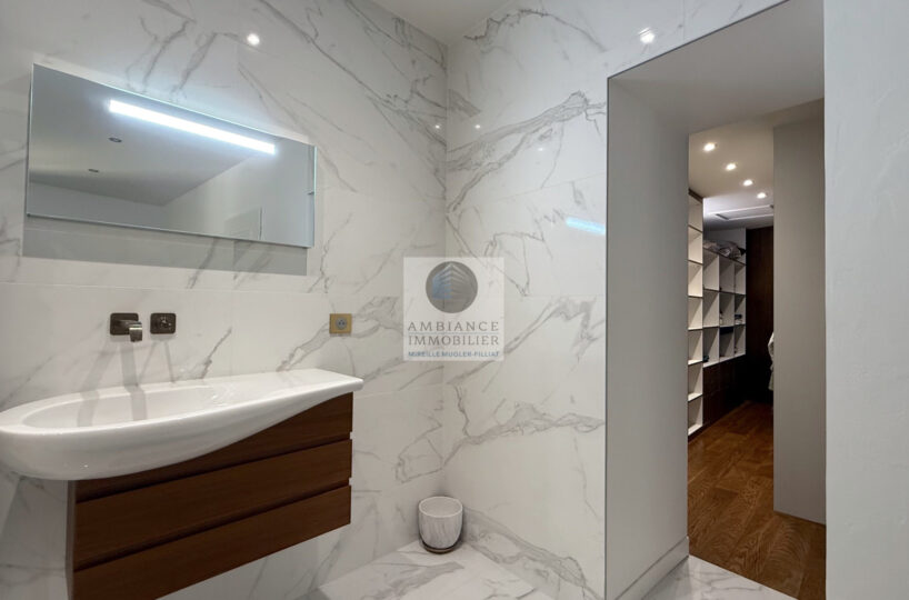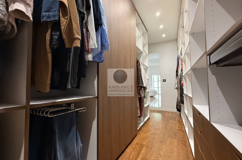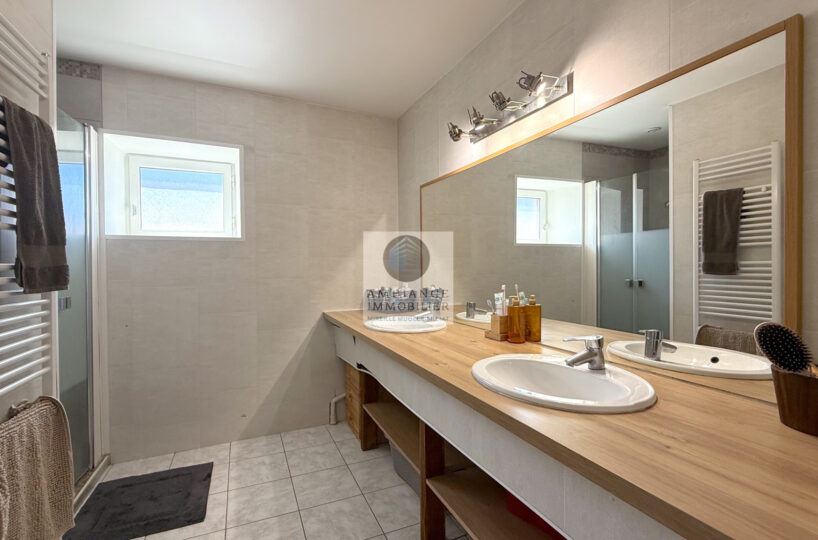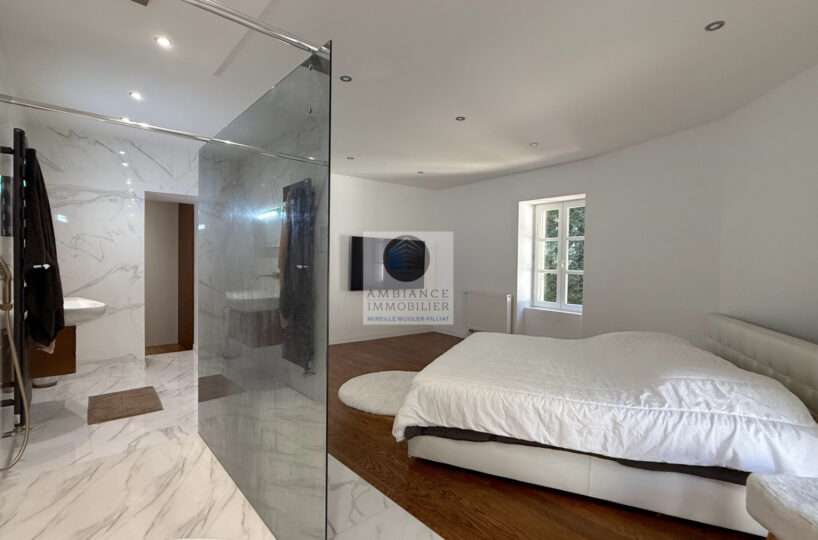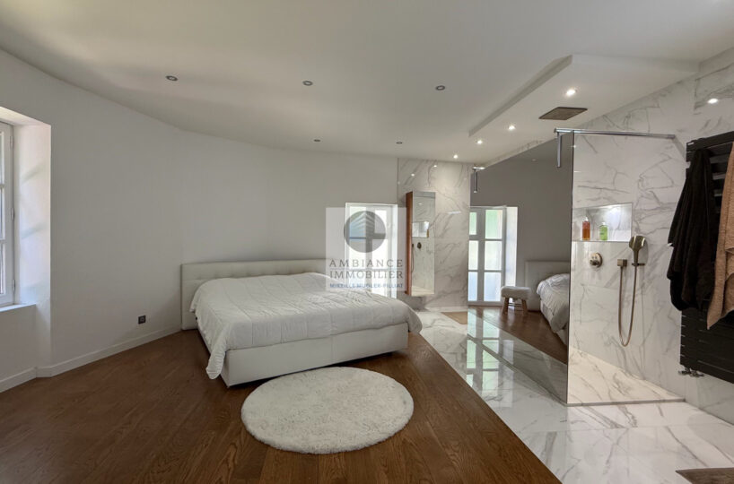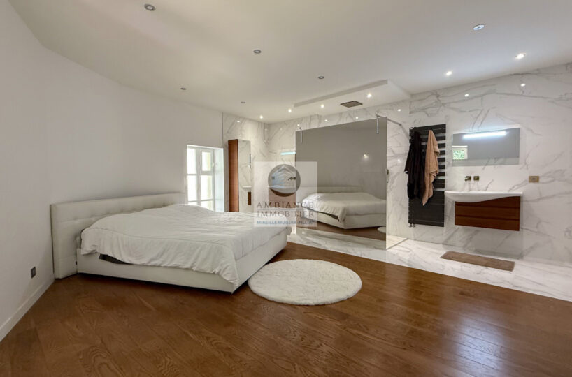 Au 1er étage : un espace nuit avec salle de bains, 3 chambres dont 1 superbe suite parentale de 35m2 avec salle d’eau : douche à l’italienne, 2 vasques et un dressing de 9m2.
