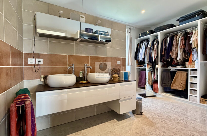 Au 1er étage : 1 chambre parentale de 15m2 et 1 chambre d’amis ou bureau de 12m2 avec toutes deux accès à une salle d’eau avec dressing : 2 vasques et douche à l’italienne.