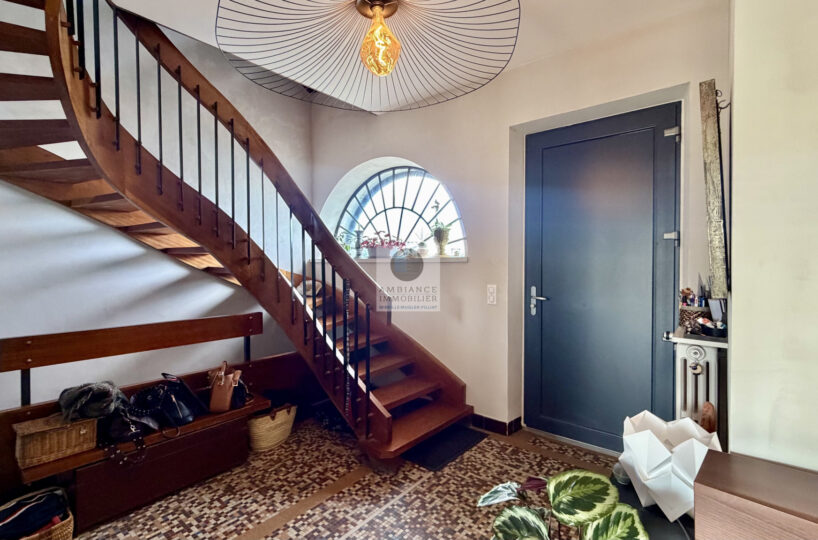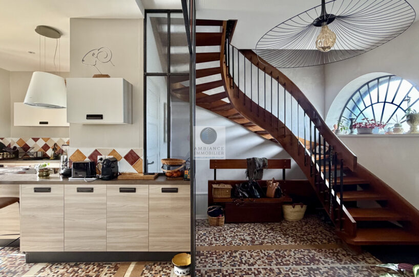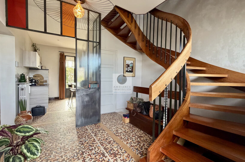 Superbe escalier en bois, beaux parquets et carrelage style mosaïque, verrière d’atelier revisitée et de beaux volumes…