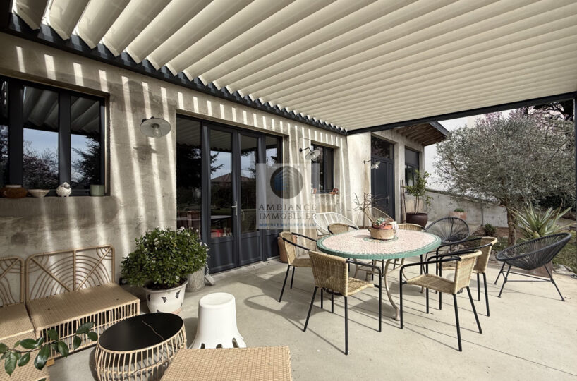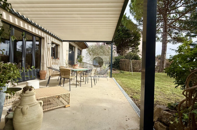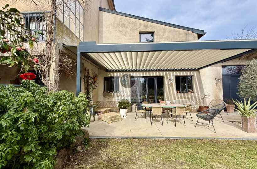 Une cuisine d’été/salon de 30m2 avec accès au jardin et à une terrasse de 37m2 avec pergola bio-climatique, un véritable lieu de vie aux beaux jours.