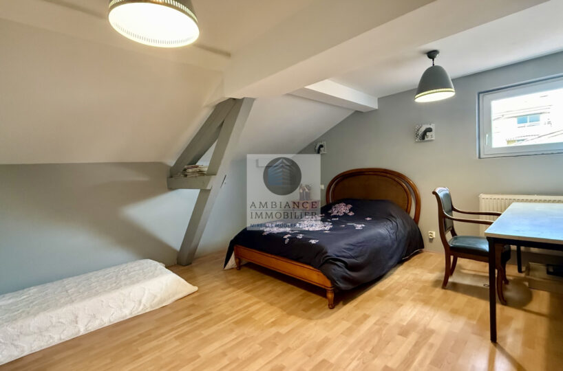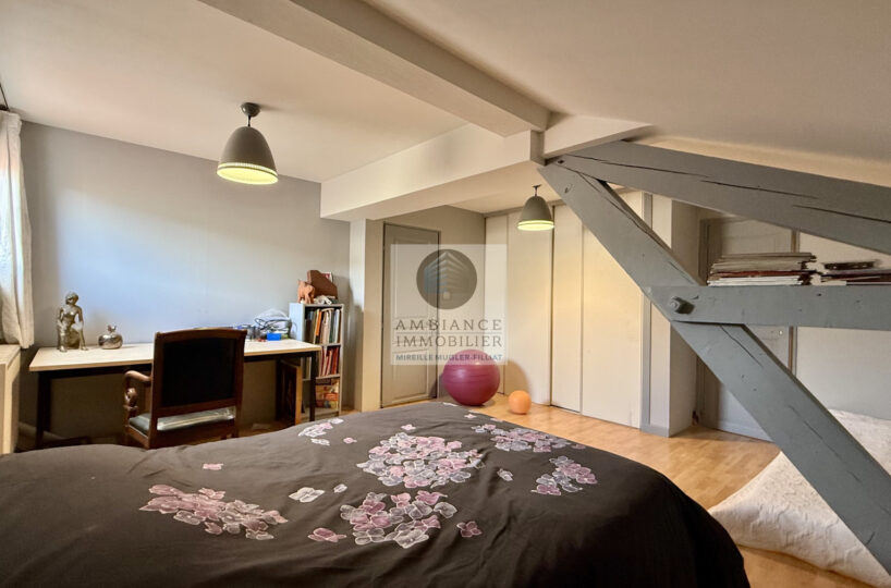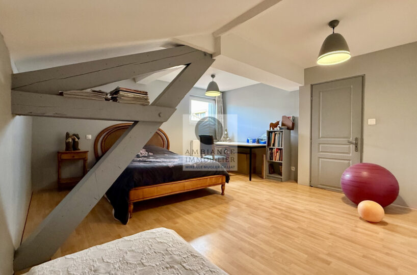 A l’étage, le charme de la charpente apparente pour l’espace enfants : 2 chambres spacieuses avec dressings, une salle d’eau.