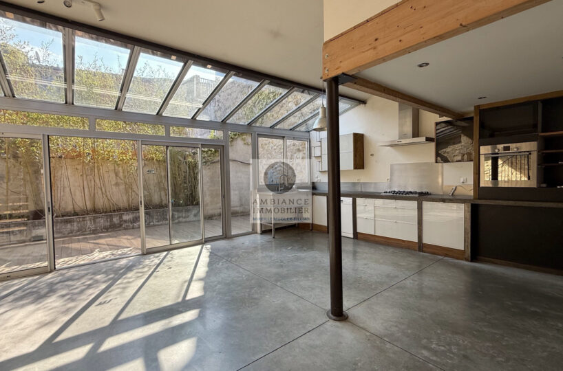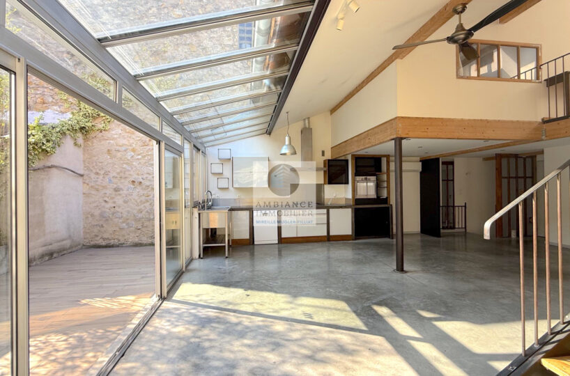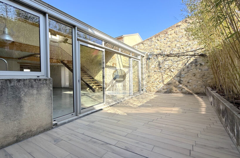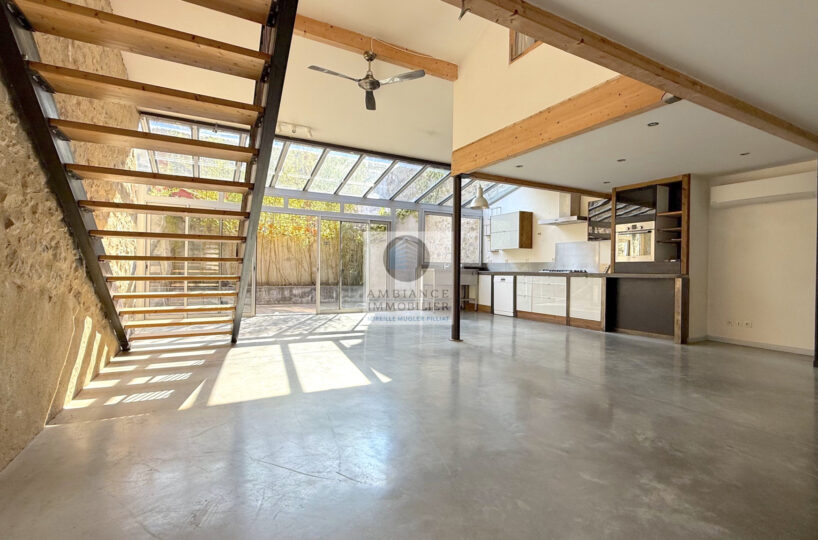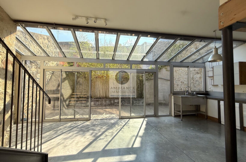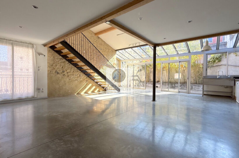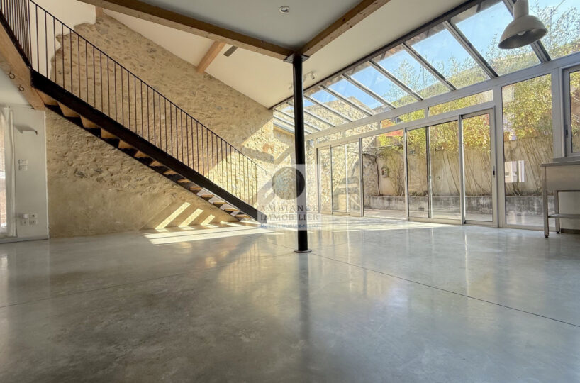 LIVRON-SUR-DRÔME, le centre ville et le calme, la luminosité et de beaux volumes pour cet ancien atelier de menuiserie transformé avec brio en maison de ville avec patio et garage.