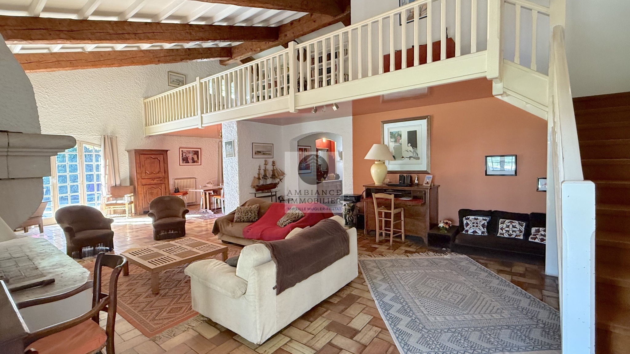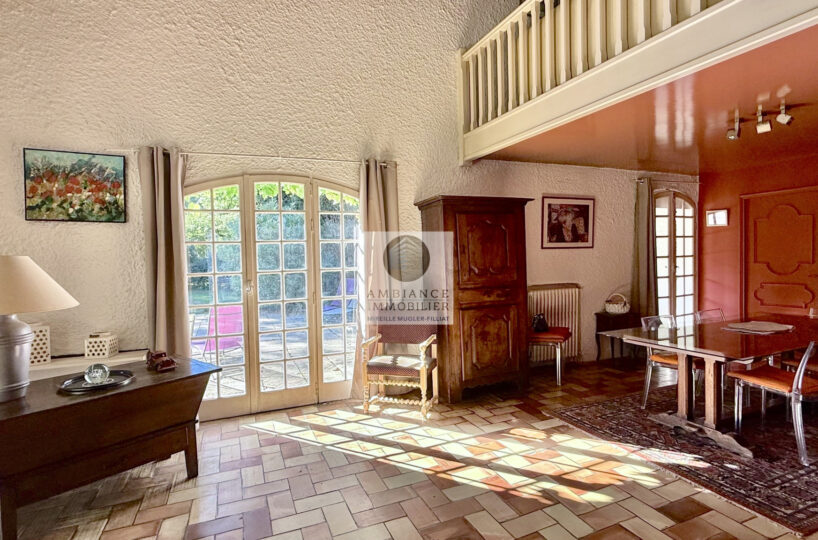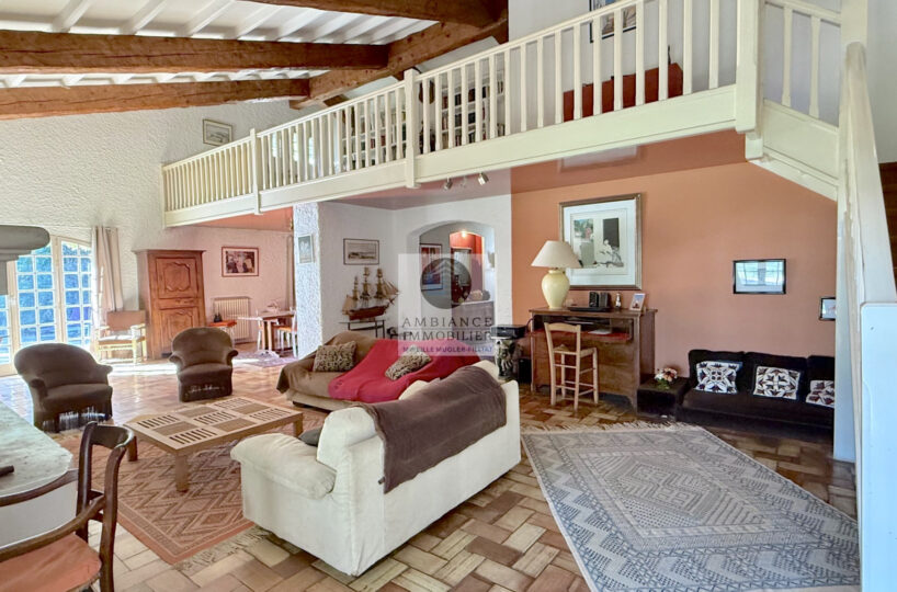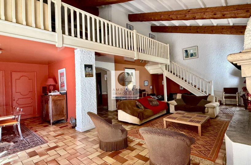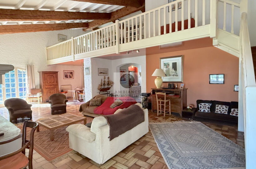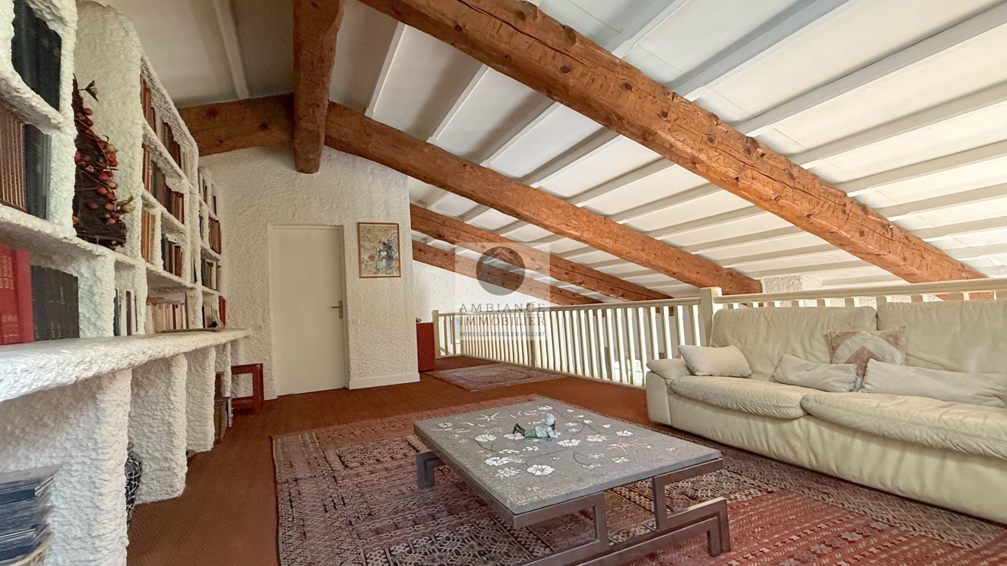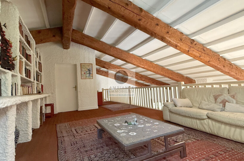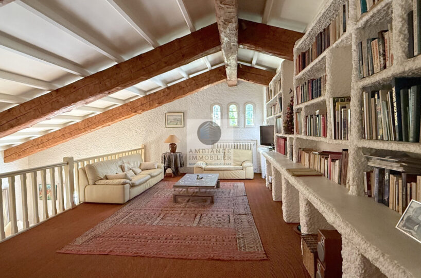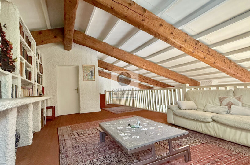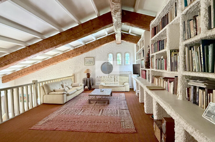 Une mezzanine surplombant la pièce vie : un salon détente lecture/TV de 33m2 avec bibliothèque intégrée et 1 chambre d’amis ou bureau de 10m2