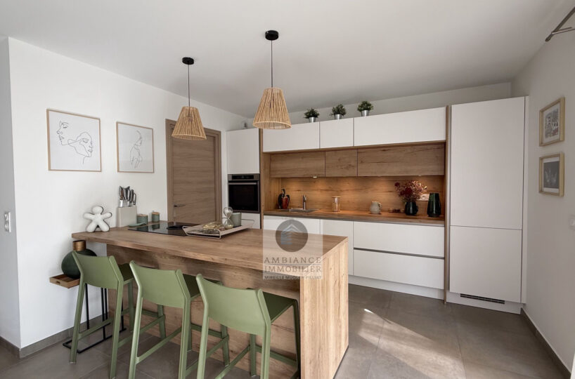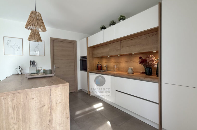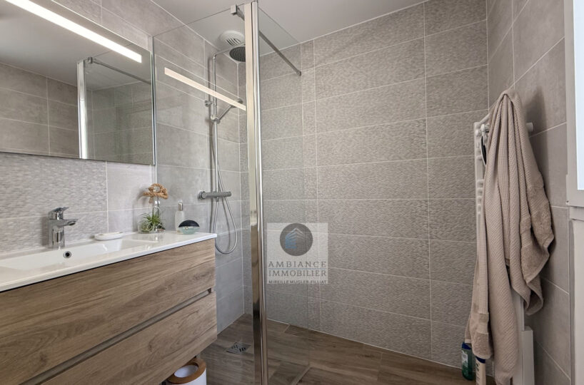 Une pièce de vie de 38m2 : séjour-salon, cuisine intégrée avec une grande baie vitrée au sud offrant une belle perspective sur l’extérieur, buanderie/cellier, une chambre de 12m2 et une salle d’eau avec douche à l’italienne et vasque.