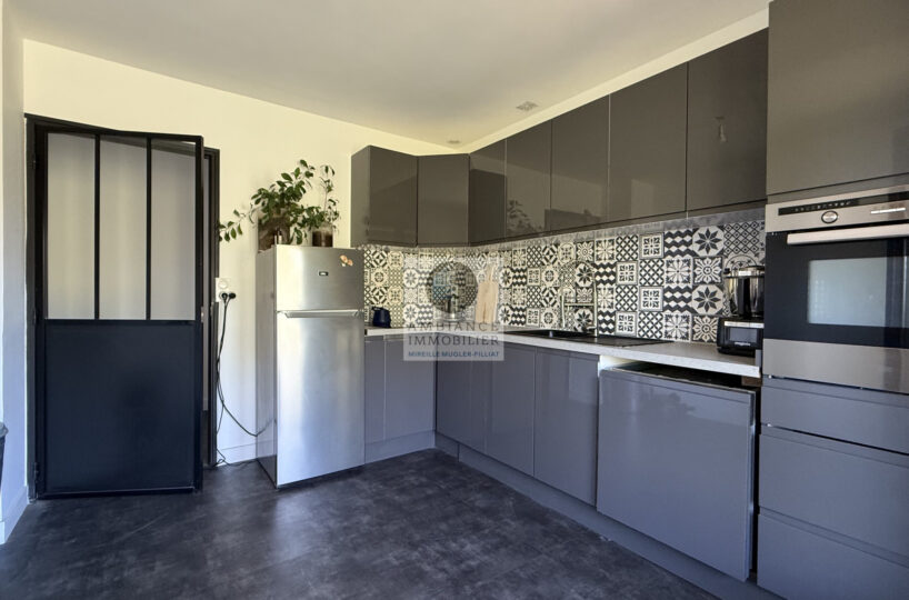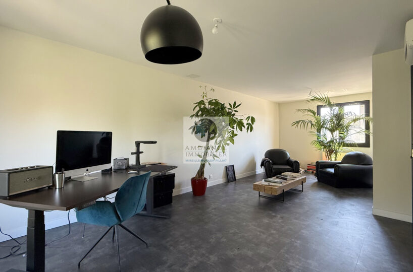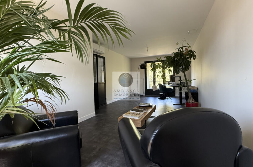 Au 1er étage : un dégagement avec de belles portes style atelier desservant un salon-séjour de 27m2 avec une double exposition et accès à une terrasse, une cuisine intégrée, 2 chambres, une salle d’eau avec douche à l’italienne et vasque.