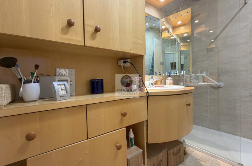 Un espace nuit avec 2 chambres, salle d’eau avec douche à l’italienne et vasque.