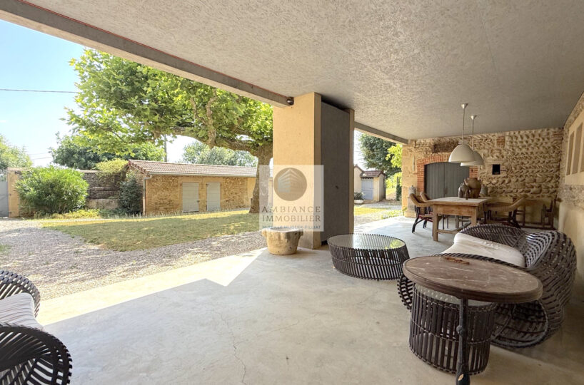 Une entrée par une superbe cour intérieure : le contraste de l’ancien avec une partie de la façade vitrée et une belle ambiance de terrasse couverte.