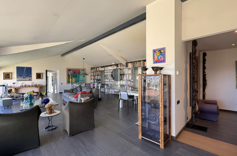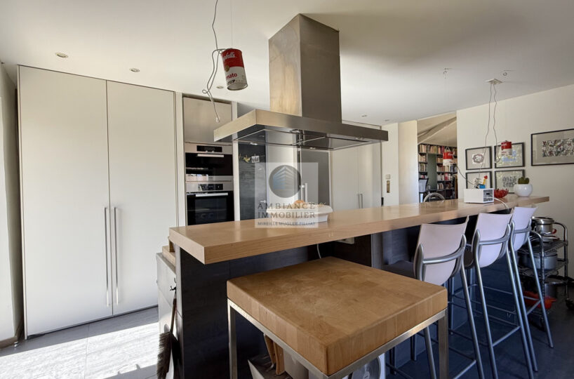 Une magnifique pièce de vie de 70m2 : salon-séjour avec cheminée et tout un pan de mur en bibliothèques, de grandes baies vitrées offrant une belle perspective sur le paysage, une cuisine intégrée de 23m2 avec une arrière cuisine/cellier et un accès à une vaste terrasse et au jardin.